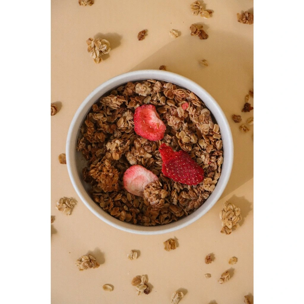 Naše poctivě pečená granola s hořkou čokoládou a lyofilizovanými jahodami je ideální volbou pro zdravé a chutné snídaně či snack. Díky pečení je extra křupavá a plná chuti, slazená pouze medem – bez přidaného cukru, vyrobená z přírodních surovin, které podpoří zdravý životní styl a dodají tělu energii.